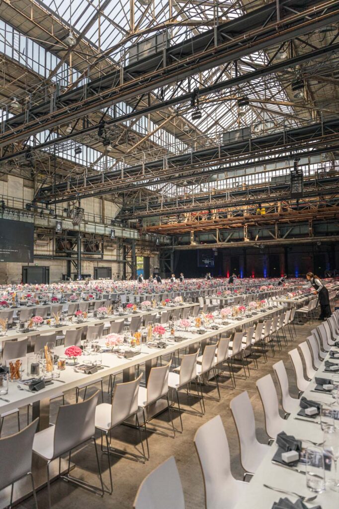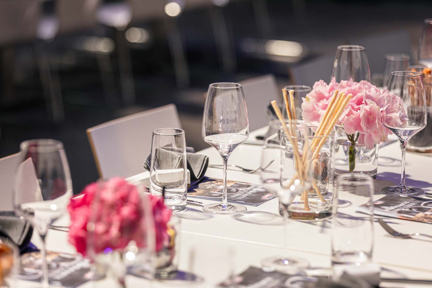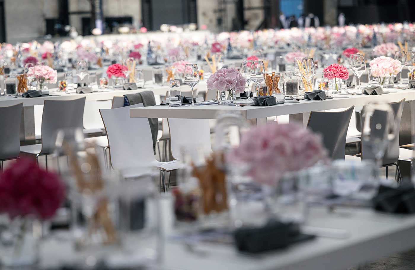 Bei der Veranstaltung wurden die Gäste bereits zum Empfang von einem Walking Act begrüßt, danach wurde Flying Fingerfood für einen lebendigen und eleganten Start gereicht. Am Tisch wurden zusätzlich Süßigkeiten als kleine Highlights eingesetzt. Das Buffet wurde mehrfach gespiegelt, um kurze Wege zu gewährleisten und allen Gästen ein zügiges und entspanntes Genusserlebnis zu ermöglichen.