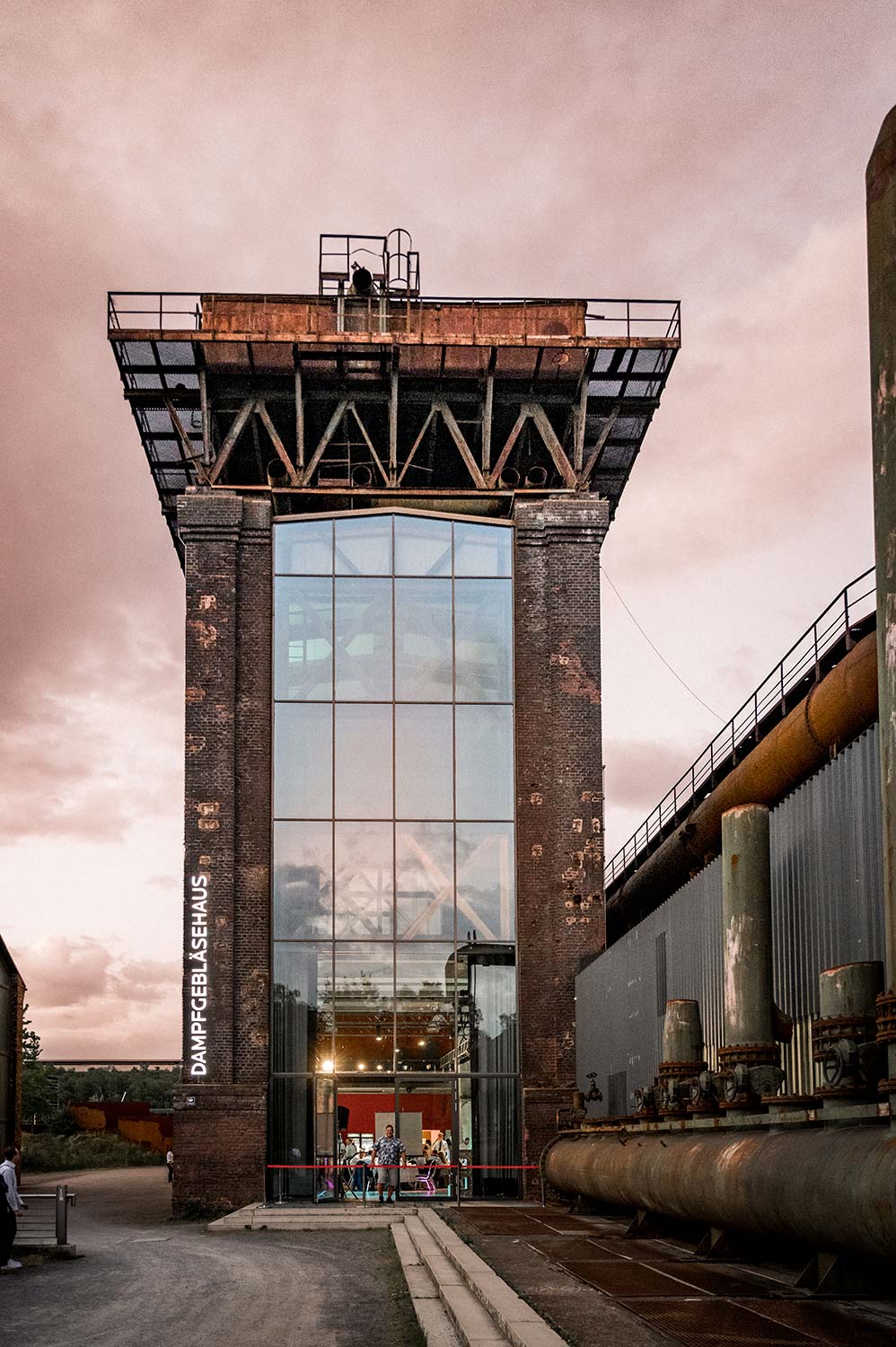 Das denkmalgeschützte Dampfgebläsehaus an der Jahrhunderthalle Bochum beeindruckt durch seine rund 16 Meter hohe Glasfront.