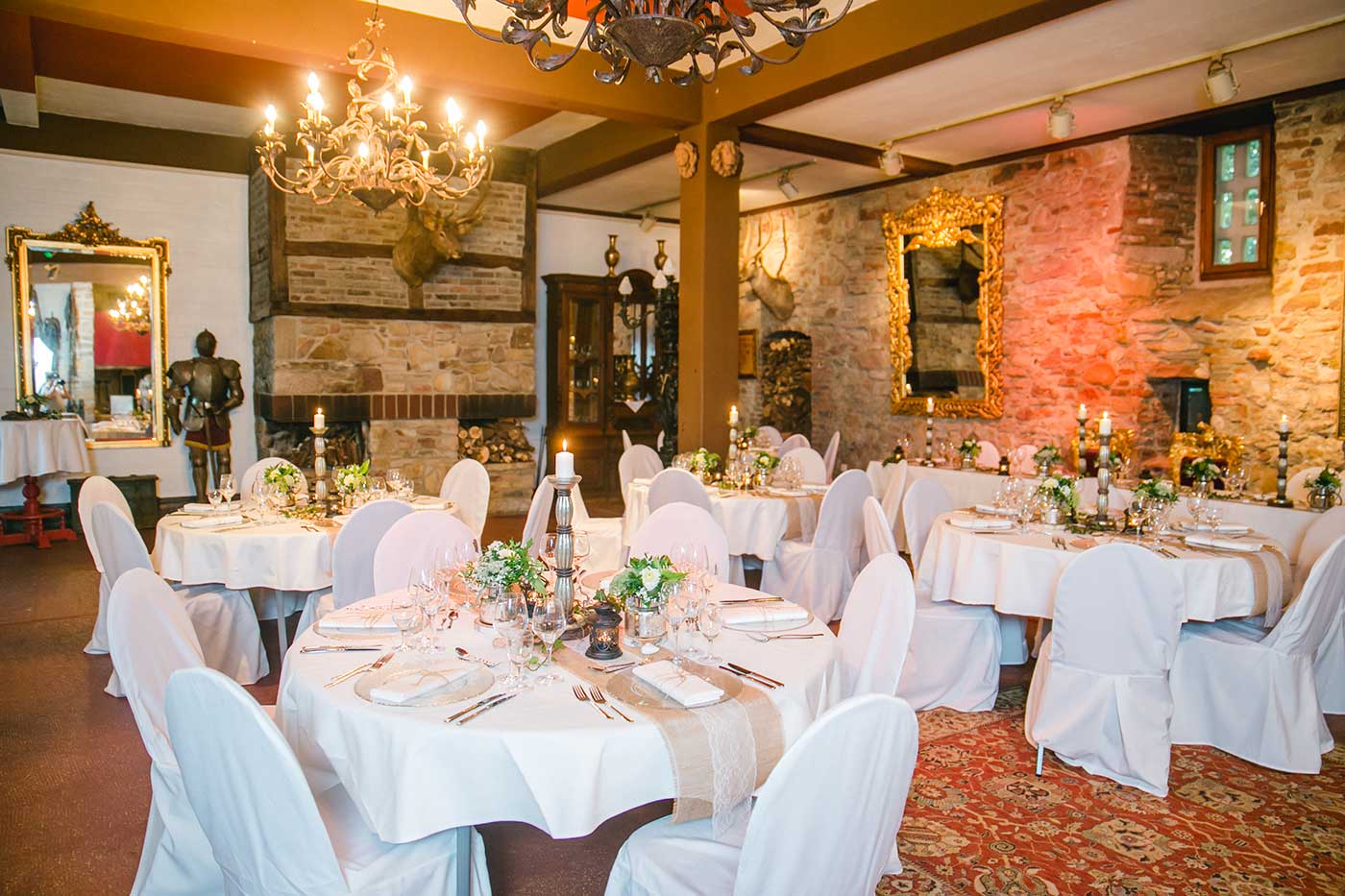 Rittersaal – Die meisten der hier stattfindenden Feiern bewegen sich im Bereich um die 60 Personen. Gemütliches Gemäuer, Kerzenleuchter, Kamine und eine einladende Bar aus Holz – der Rittersaal ist der rustikalste der drei Festsäle. Der Rittersaal überzeugt durch seine gemütliche, rustikale Atmosphäre, zwei offene Kamine sowie die eingebaute Bar und Theke für den Ausschank von Getränken. Wie auch die beiden anderen Säle ist der Rittersaal liebevoll eingerichtet mit Bildern, Spiegeln und Dekorationen. Das Besondere – man kann über eine Treppe eine erhöhte Etage erreichen, die zum Saal hin offen ist. Von dort kann man zum Beispiel hervorragend eine Rede halten oder Fotos und Videos machen.