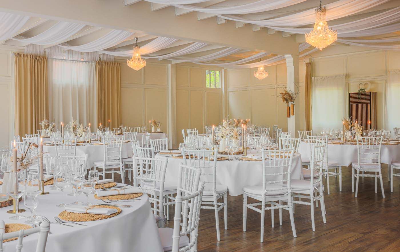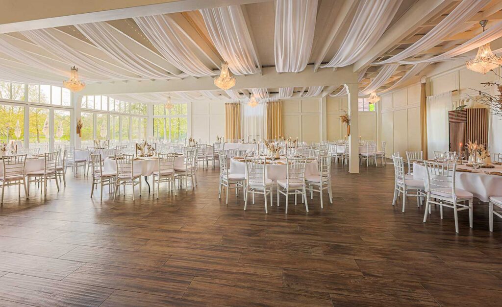 Ausgestattet mit runden Banketttischen, getoppt mit weißen Chiavari Stühlen können Sie ein unvergessliches Event in der Villa Schwanensee verbringen. Kinderhochstühle werden auf Wunsch gerne zur Verfügung gestellt. Angrenzend zur Tanzfläche ist ein fest installierter Fotobox-Hintergrund mit NEON Sign gegeben. Eine großzügige Raumdekoration, sowie eine hochwertige Musikanlage sind bereits fest installiert.