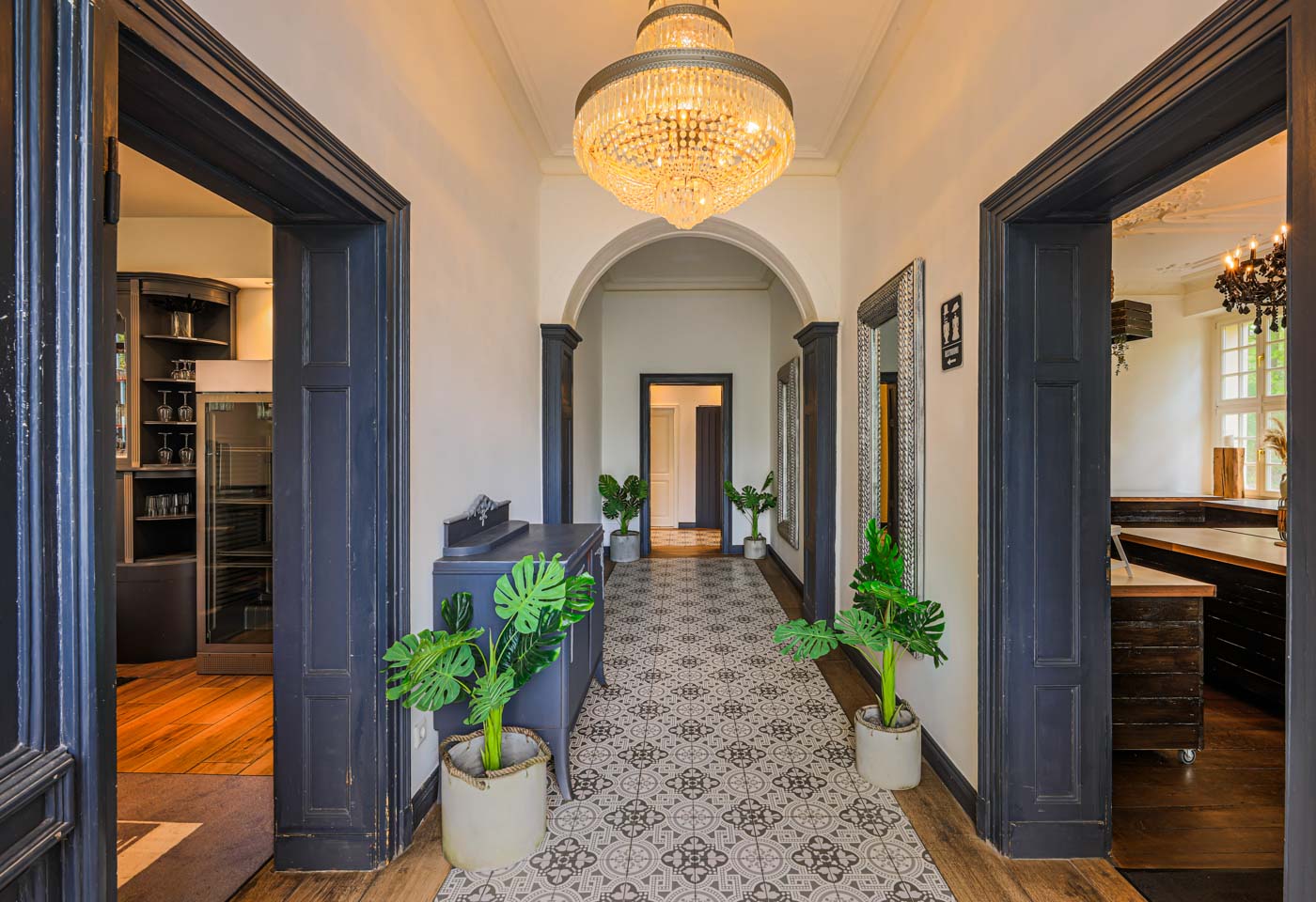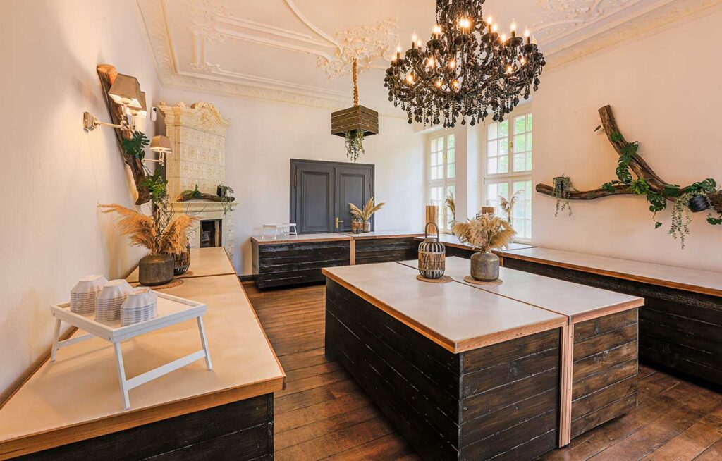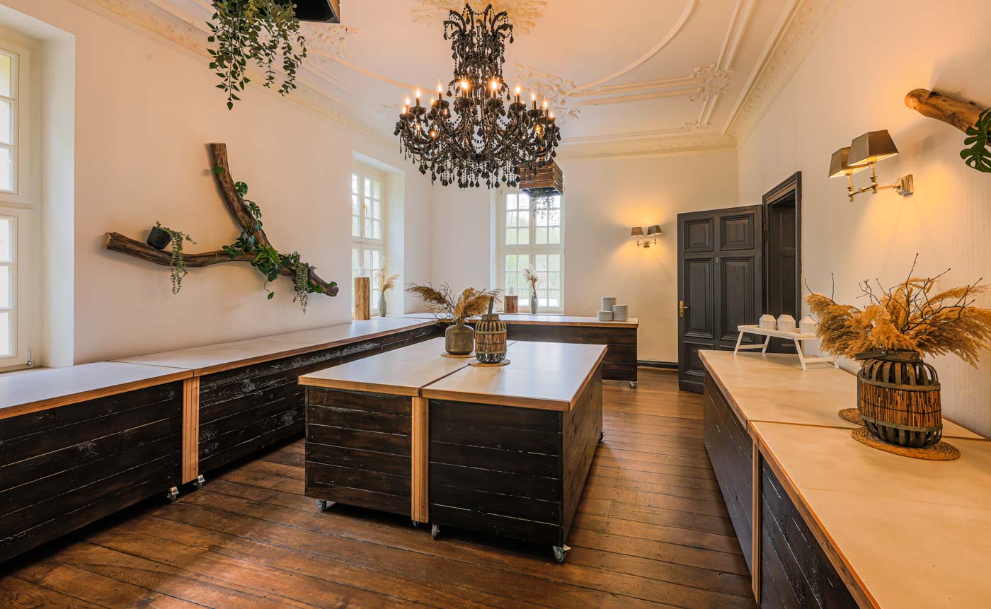 Die große Theke ist bereits beim Betreten der Villa Schwanensee ein Hingucker, damit steht der Party nichts mehr im Wege. Der separat liegende Buffetbereich lädt Sie und Ihre Gäste zum Schlemmern ein. Im ersten Obergeschoss der Villa Schwanensee befinden sich zwei Getting Ready Rooms, welche im Falle einer freien Trauung vor Ort gerne von unseren Paaren gebucht werden können.