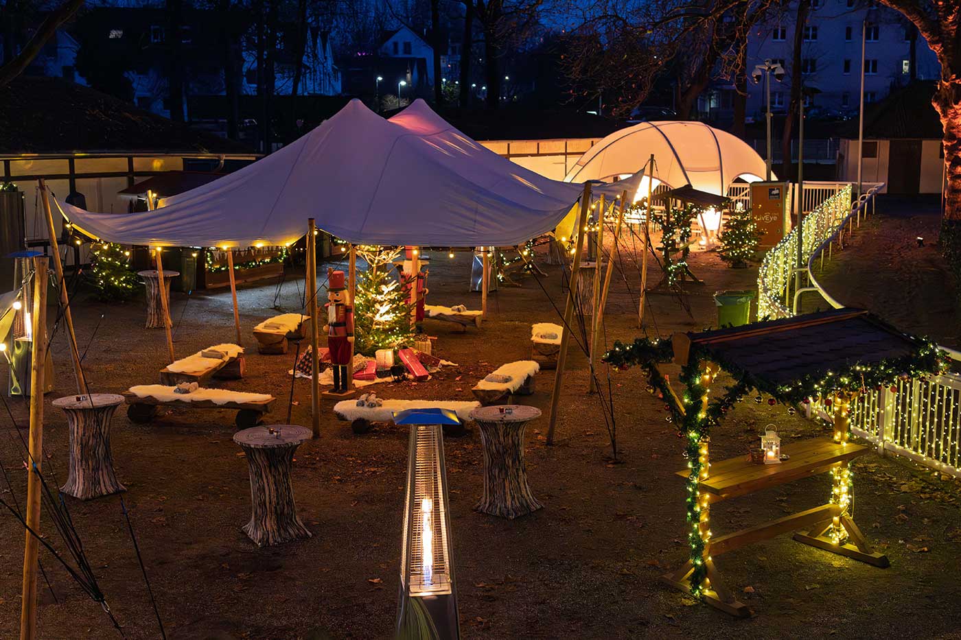 Stimmungsvolle Markthütten, festliche Beleuchtung, Lichterketten und weihnachtliche Musik schaffen eine authentische Weihnachtsmarkt-Atmosphäre. Winterliche Spezialitäten, Glühwein und gebrannte Mandeln sorgen für kulinarische Highlights und laden zum gemeinsamen Genießen ein. Thematisch gestaltete Bereiche mit Krippenszenen, Weihnachtsbäumen und dekorativen Elementen schaffen abwechslungsreiche Perspektiven innerhalb des Events.
