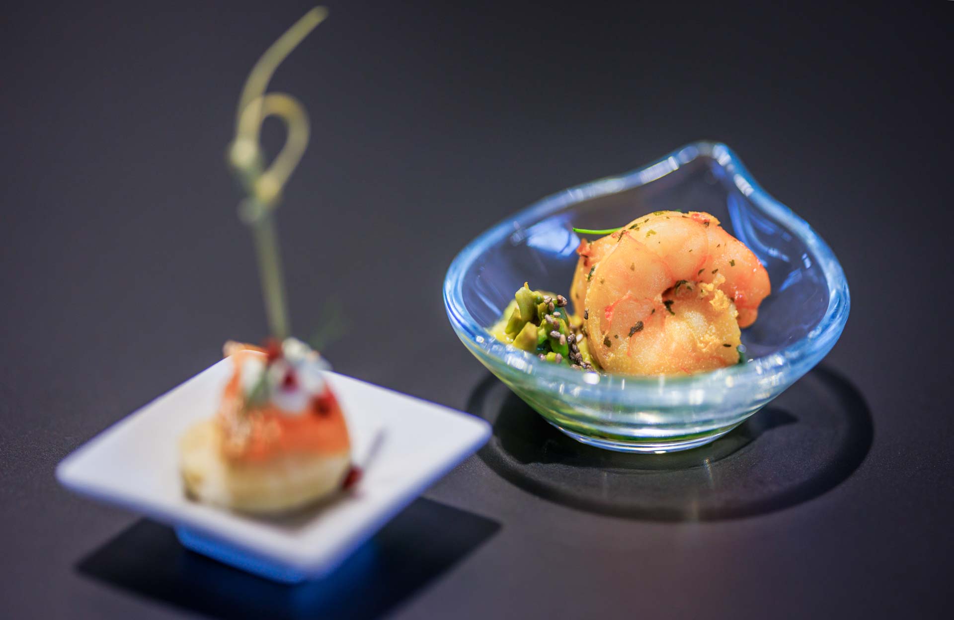Sechs gespiegelte Buffets mit Live-Cooking-Stationen an denen à la minute Kingprawns und dry-aged gereifte Steaks nach Wunsch der Gäste zubereitet wurden