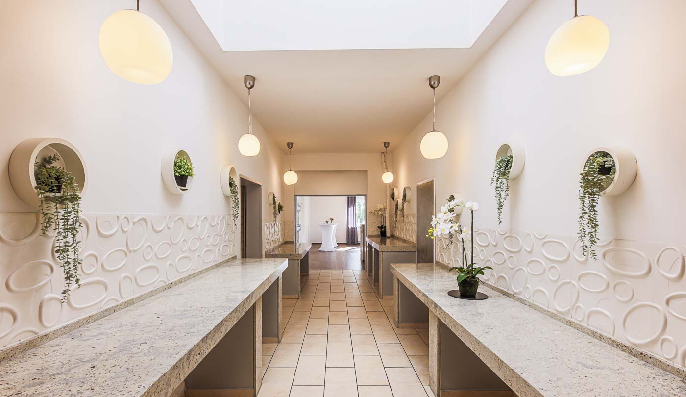 Das Raumkonzept überzeugt durch eine klare Raumaufteilung: Ein dunkler Fliesen Fussboden, eine helle Kalksteinwand mit hinterlegter LED Installation sowie die geschwungene Getränkebar runden den Bankett Bereich optimal ab, während der angeschlossene Buffetbereich ausreichend Platz für die Speisenpräsentation bietet.