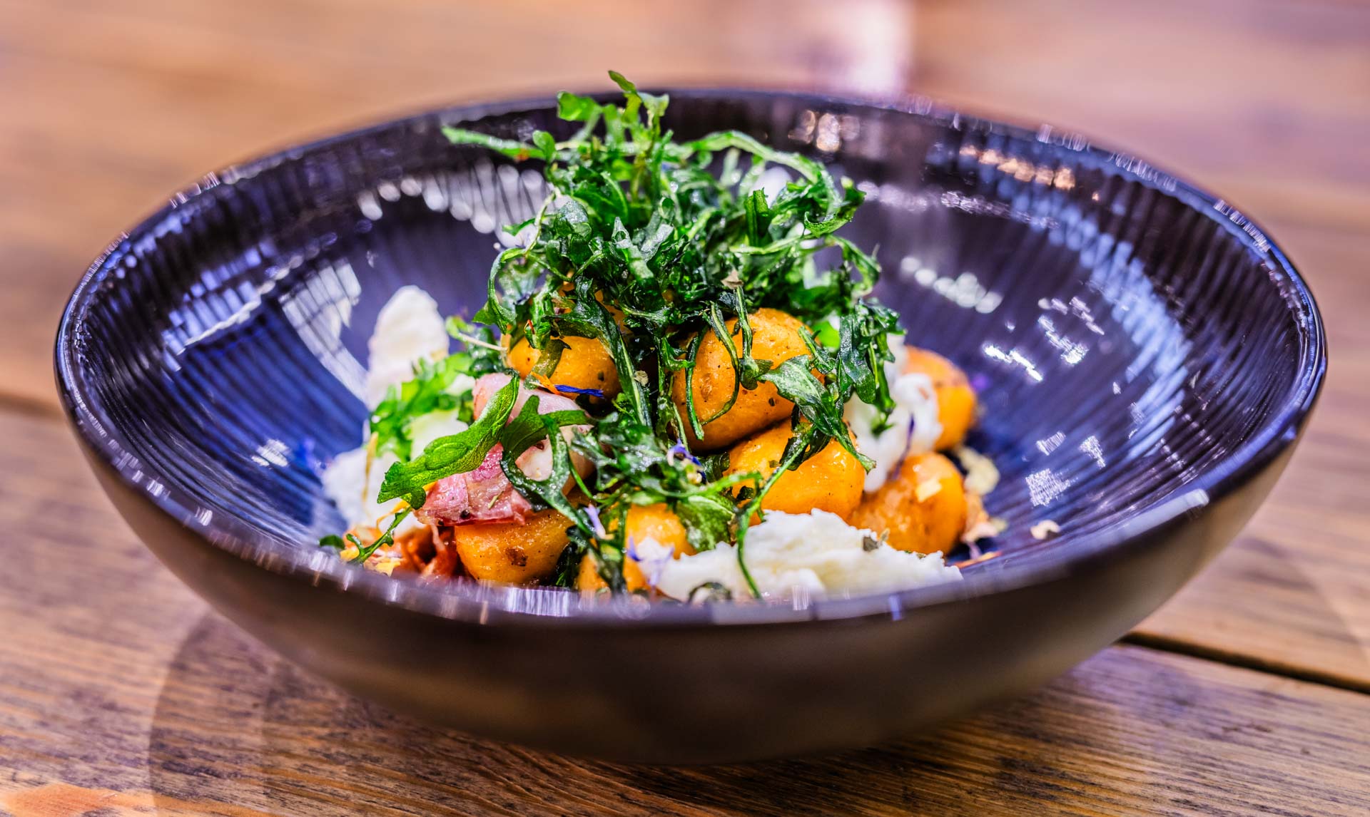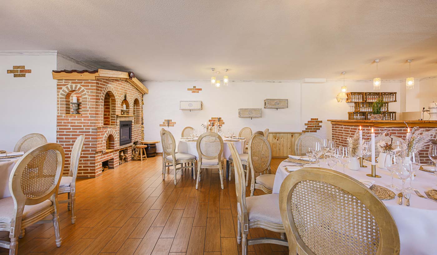 Der optimale Stilmix aus „Shabby Chic“ und „Landhaus“ – warme Holzelemente an den Fensterbänken oder aber der Kamin aus Backstein sowie die verspielte Thekenanlage als auch die filigranen Deckenleuchten verleihen dem Raum seinen Wohlfühlcharakter.